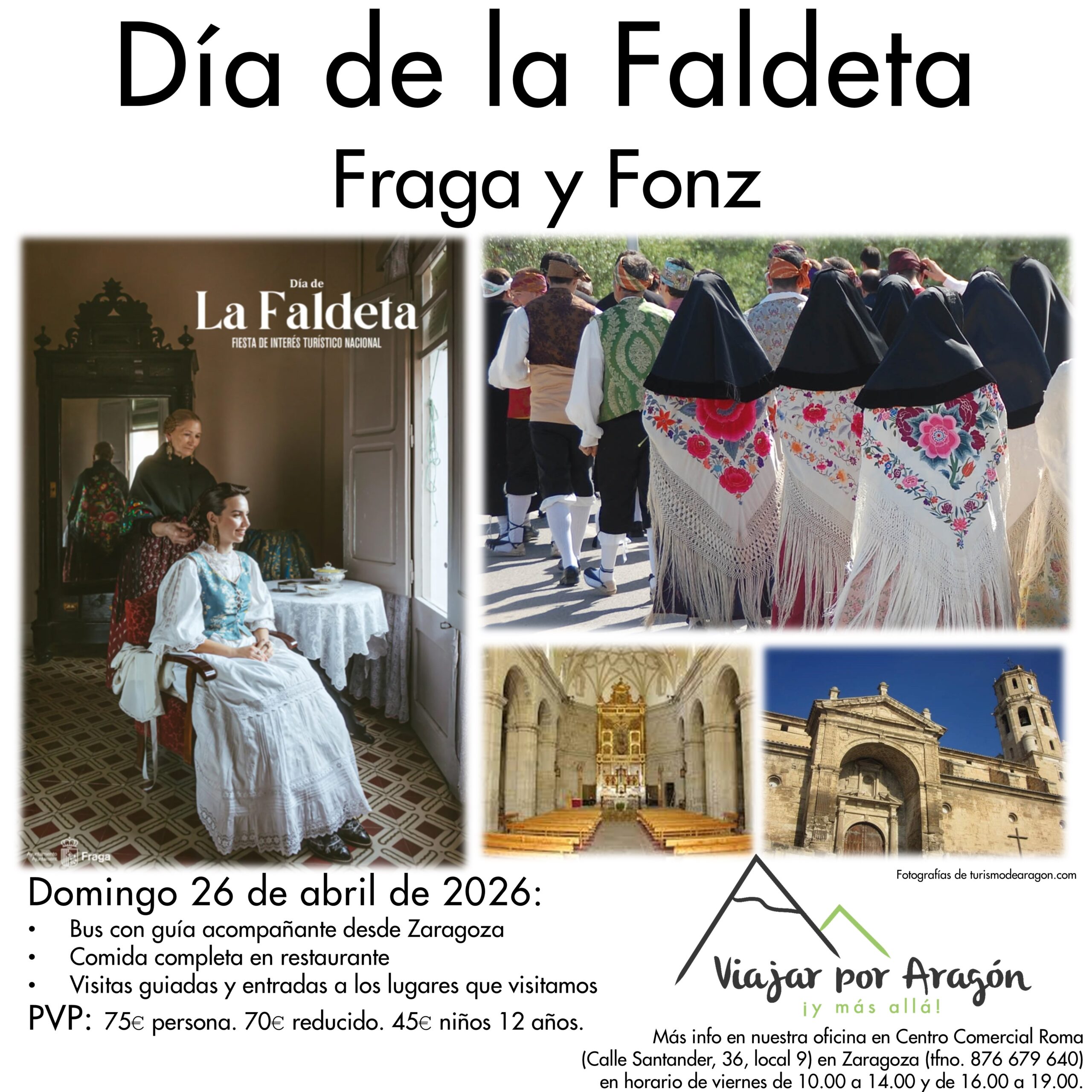 FECHA: Domingo 26 de abril ITINERARIO: 08:30 Salida desde Zaragoza 10:30 Tiempo libre para disfrutar del Día de la Faldeta 13:45 Salida al restaurante 14:30 Comida completa en restaurante 16:30 […]