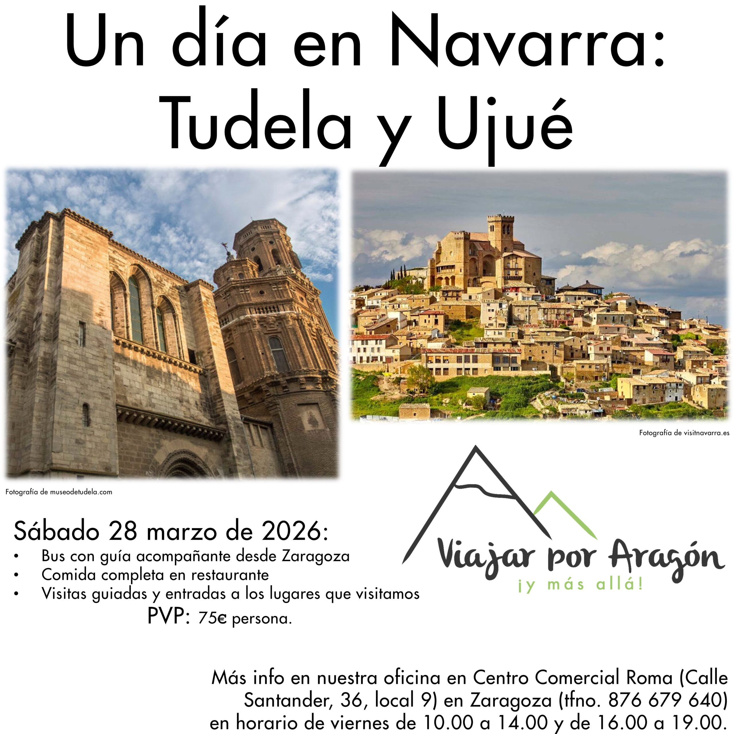 FECHA: Sábado 28 de marzo ITINERARIO: 08:00 Salida desde Zaragoza 10:00 Visita a la Catedral de Santa María (Tudela) 13:00 Comida completa en restaurante 15:00 Salida a Ujué 16:30 Visita guiada […]